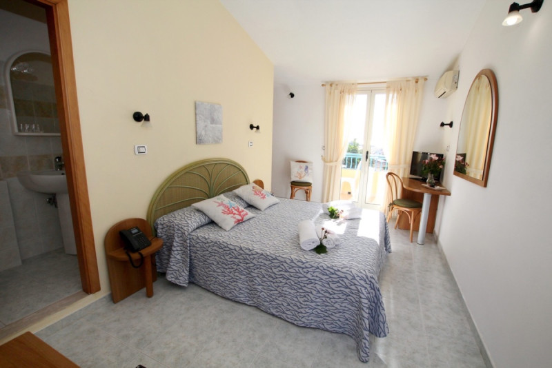 Ubytování v hotelových pokojích nebo v apartmánech. Hotelový komplex tvoří 2 budovy a apartmánové domy. Součástí hotelu jsou 2 bazény, jeden pro děti a jeden pro dospělé, s lehátky a slunečníky, restauace s jídelnou, bar s terasou a animačním programem, posilovnou. Pokoje i apartmány jsou v přízemí nebo v patře, všechny mají terasu s výhledem na bazén nebo do překrásné subtropické zahrady, plné olivovníků, fíkovníků, oleandrů, opuncíí, exotických jehličnanů a tropických palem. Hotel má kapacitu 65 pokojů.