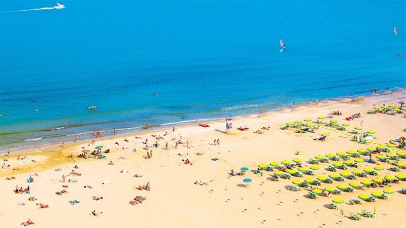 Pro pobřeží Rimini je typická velmi široká a dlouhá pláž se zlatavým jemným pískem a přilehlou promenádou. Pláž je vhodná pro rodiny s malými dětmi, jelikož má pozvolný vstup do vody. Hotel leží jen pár kroků od písečné pláže a plážový servis je zahrnut v ceně pobytu. Vodní sporty na pláži za poplatek.